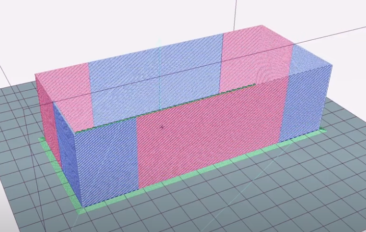 Как мы видим, печать начинается с каймы для лучшей адгезии к столу, а сам шаблон представляет собой прямоугольную стеночку в один или 2 периметра, где присутствуют не только резкие перепады скорости при движении по прямой, но и прохождение прямых углов на разной скорости, и шов.