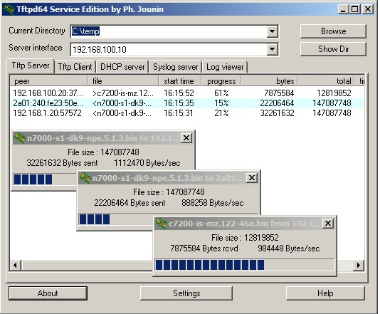 Tftpd64 - это бесплатное, легкое, готовое к IPv6 приложение с открытым исходным кодом, которое включает DHCP, TFTP, DNS, SNTP и серверы системного журнала, а также TFTP-клиент.